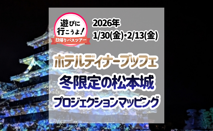 信州観光バスツアー遊びに行こうよ【ホテルディナーブッフェ・松本城プロジェクションマッピング】のご案内です!ご家族・お仲間同士・おひとり様も大歓迎!バスで楽々♪楽しい旅へ出かけましょう!旅の