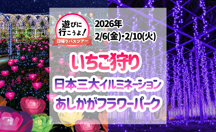 信州観光バスツアー遊びに行こうよ【いちご食べ放題・日本三大イルミネーションあしかがフラワーパーク】のご案内です!ご家族・お仲間同士・おひとり様も大歓迎!バスで楽々♪楽しい旅へ出かけましょう!