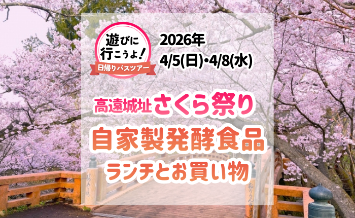 信州観光バスツアー遊びに行こうよ【高遠城址さくら祭り・自家製発酵食品のランチ】のご案内です!ご家族・お仲間同士・おひとり様も大歓迎!バスで楽々♪楽しい旅へ出かけましょう!旅のポイント