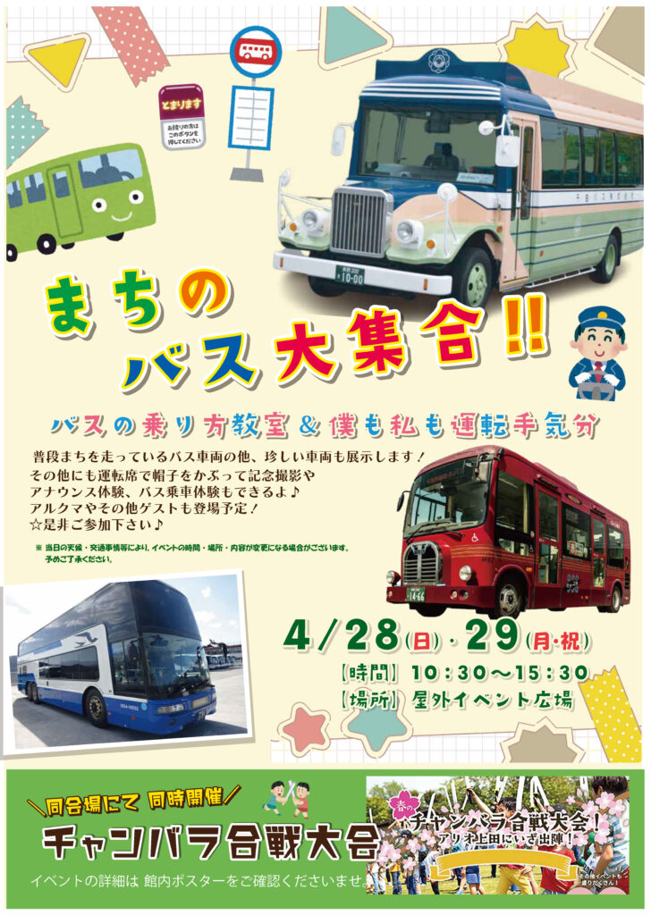 2024.04.12 2025.02.08 『まちのバス大集合』に参加します! 4月28日(日)・29日(月祝)にアリオ上田屋外イベント広場にて、『まちのバス大集合』が開催されます。 普段まちを走っているバス車両のほか、珍しい車両も展示されます。 記念撮影、乗車体験、アナウンス体験もできます! 信州観光バスでは、青のボンネットバスを展示します。 レトロでかわいいボンネットバスをぜひ見に来てくださいね(^^)★ Post Share Hatena Pocket RSS feedly Pin it ホームページをリニューアルしました♪ 前の記事 ボンネットバスでめぐる!信州上田のプチ旅★ 次の記事