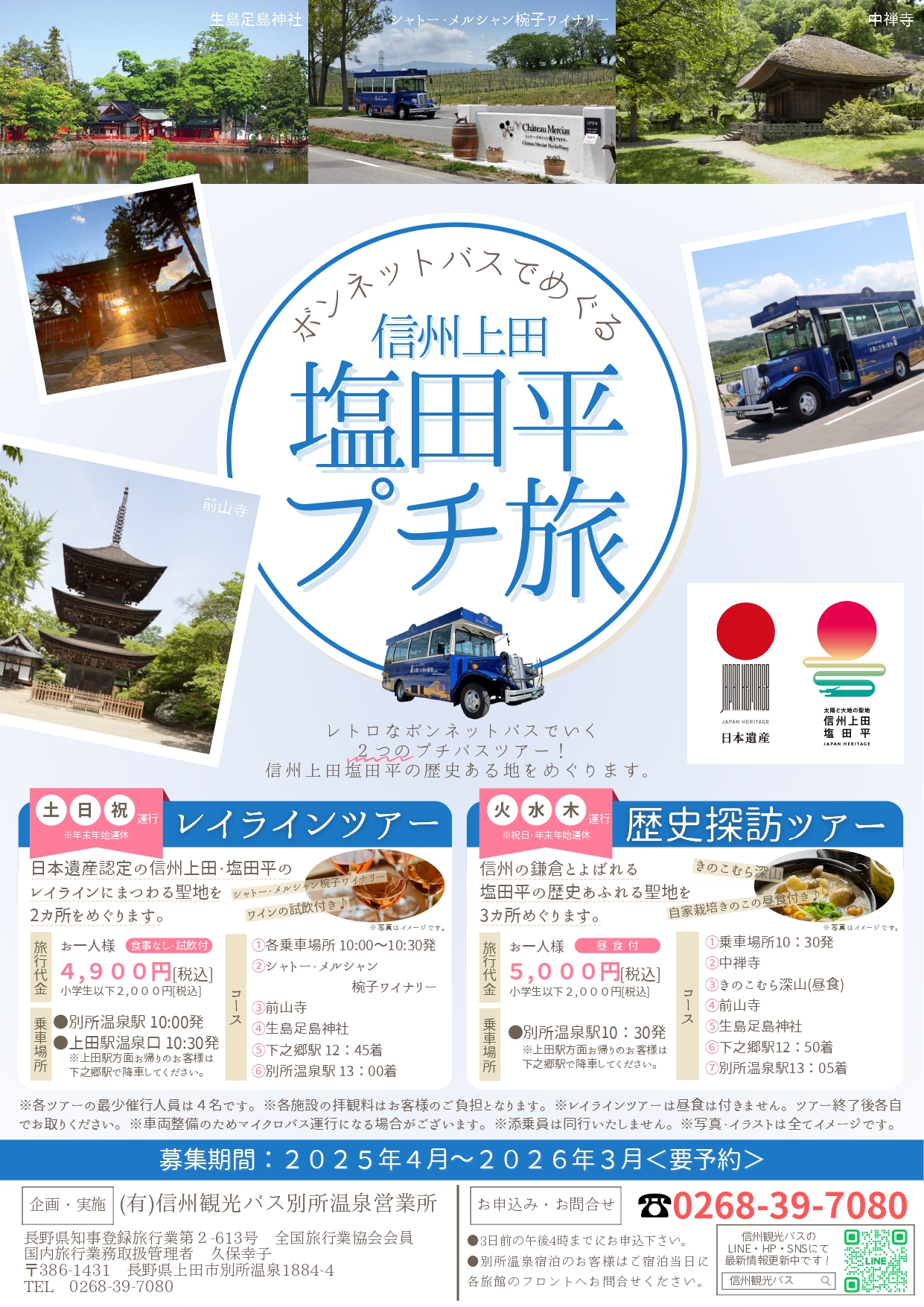 日本遺産認定のレイラインのまつわる場所や、『信州の鎌倉』とよばれる塩田平の代表する聖地をめぐります。約2時間半~3時間のプチツアーなので、上田市、別所温泉の観光のお供に最適です!